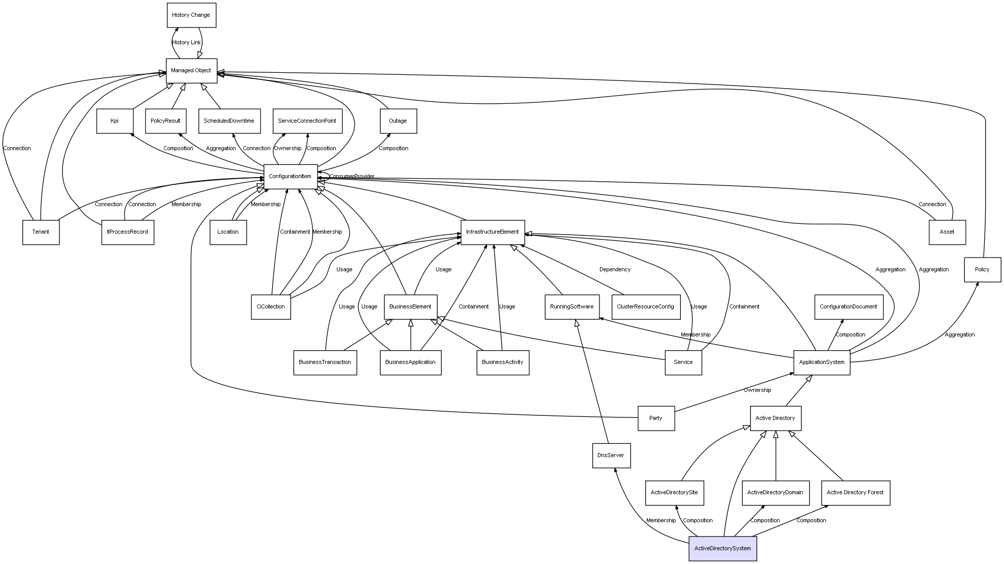 | ActiveDirectorySystem | Active Directory Forest | Composition | Represents a relation between 2 objects where one is contained within the other, and the included object can not exist without its container. Therefore, when the container is deleted, all its contained object will be automatically removed |