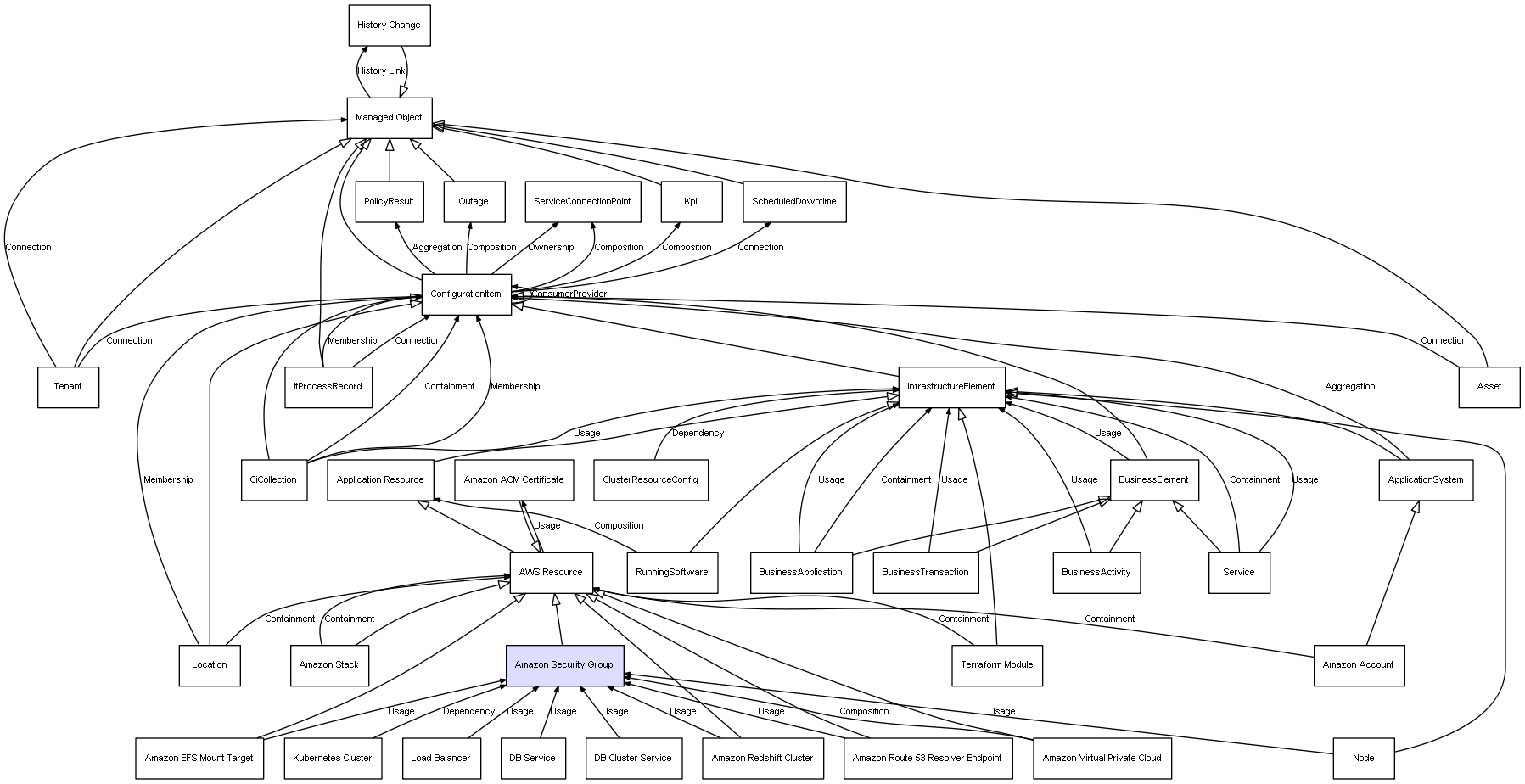 | ConfigurationItem | ServiceConnectionPoint | Composition | Represents a relation between 2 objects where one is contained within the other, and the included object can not exist without its container. Therefore, when the container is deleted, all its contained object will be automatically removed |
