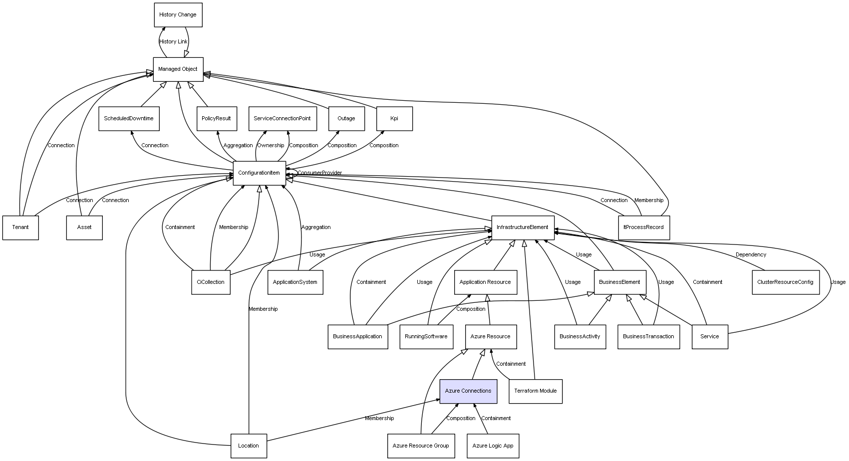 | Azure Resource Group | Azure Connections | Composition | Represents a relation between 2 objects where one is contained within the other, and the included object can not exist without its container. Therefore, when the container is deleted, all its contained object will be automatically removed |