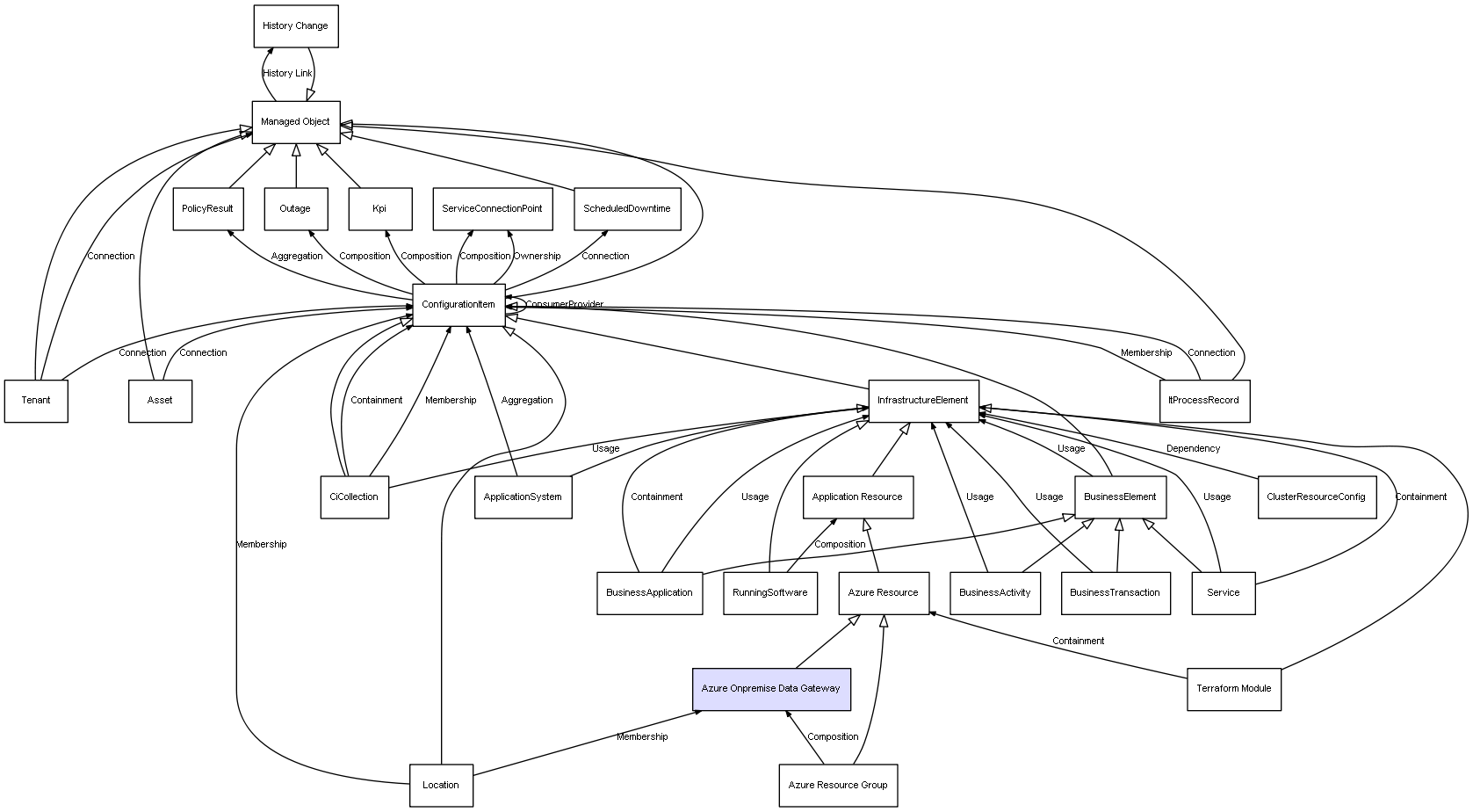 | Azure Resource Group | Azure Onpremise Data Gateway | Composition | Represents a relation between 2 objects where one is contained within the other, and the included object can not exist without its container. Therefore, when the container is deleted, all its contained object will be automatically removed |