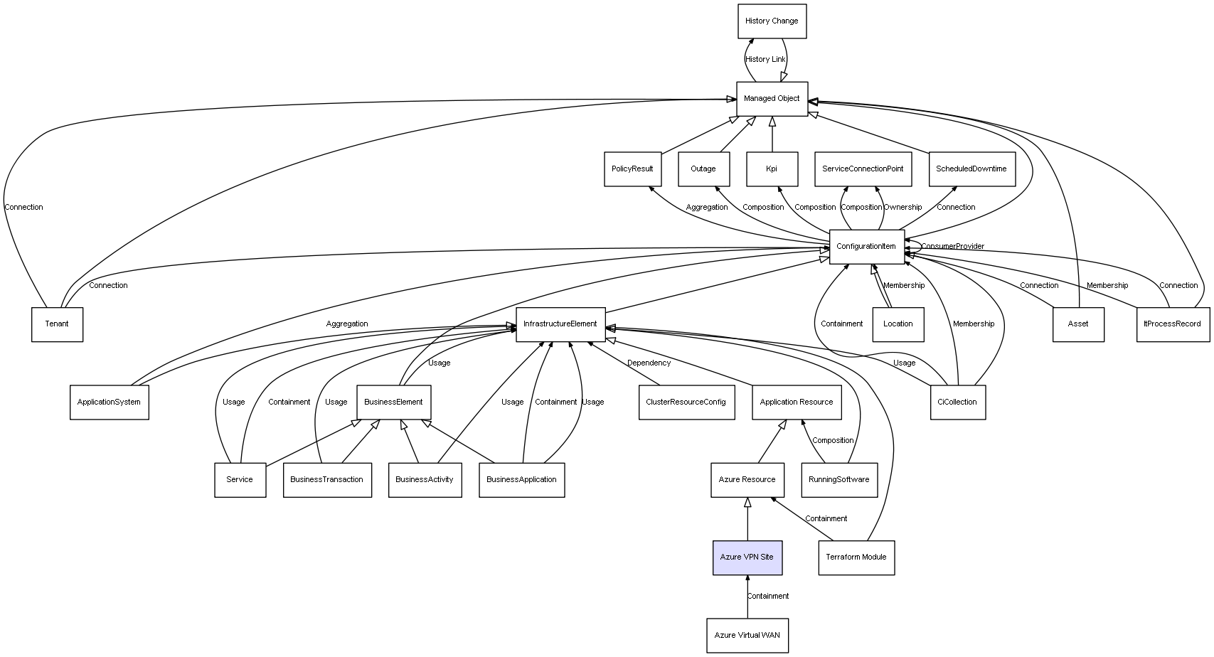 | ConfigurationItem | Outage | Composition | Represents a relation between 2 objects where one is contained within the other, and the included object can not exist without its container. Therefore, when the container is deleted, all its contained object will be automatically removed |