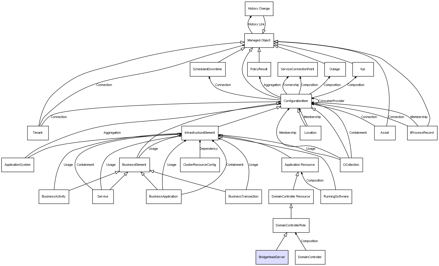 | ConfigurationItem | ServiceConnectionPoint | Composition | Represents a relation between 2 objects where one is contained within the other, and the included object can not exist without its container. Therefore, when the container is deleted, all its contained object will be automatically removed |