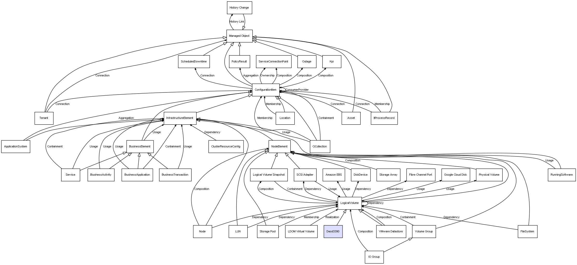 | VMware Datastore | LogicalVolume | Composition | Represents a relation between 2 objects where one is contained within the other, and the included object can not exist without its container. Therefore, when the container is deleted, all its contained object will be automatically removed |