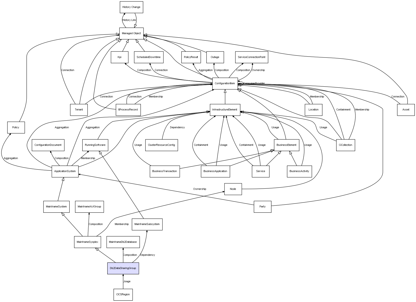 | Db2DataSharingGroup | MainframeDb2Database | Composition | Represents a relation between 2 objects where one is contained within the other, and the included object can not exist without its container. Therefore, when the container is deleted, all its contained object will be automatically removed |