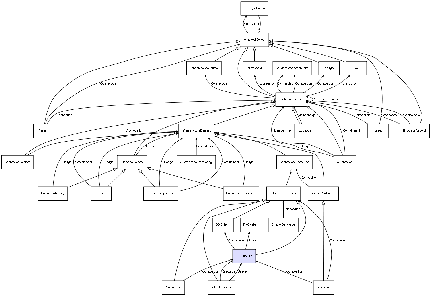 | Database | DB Data File | Composition | Represents a relation between 2 objects where one is contained within the other, and the included object can not exist without its container. Therefore, when the container is deleted, all its contained object will be automatically removed |