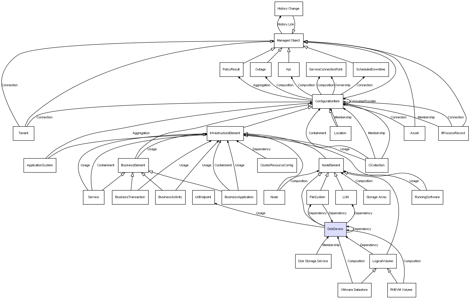 | DiskDevice | LUN | Dependency | represents a dependency between 2 objects |