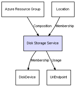 | Azure Resource Group | Disk Storage Service | Composition | Represents a relation between 2 objects where one is contained within the other, and the included object can not exist without its container. Therefore, when the container is deleted, all its contained object will be automatically removed |