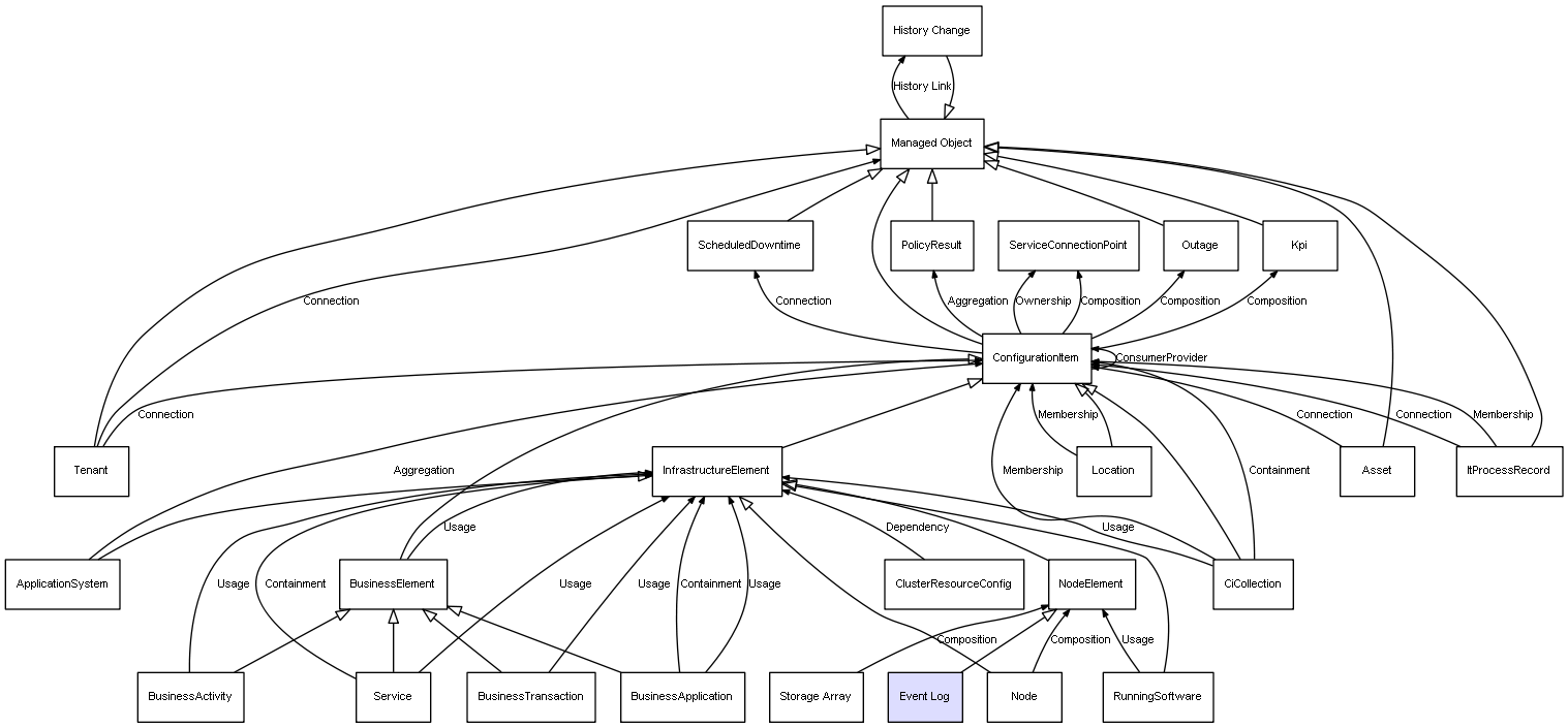 | ConfigurationItem | Outage | Composition | Represents a relation between 2 objects where one is contained within the other, and the included object can not exist without its container. Therefore, when the container is deleted, all its contained object will be automatically removed |