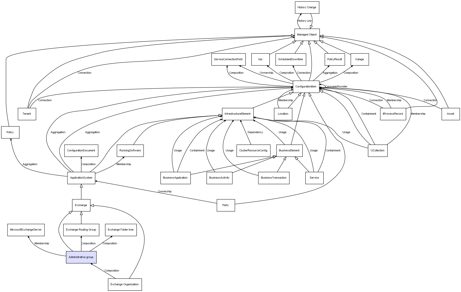 | Administrative group | Exchange Folder tree | Composition | Represents a relation between 2 objects where one is contained within the other, and the included object can not exist without its container. Therefore, when the container is deleted, all its contained object will be automatically removed |