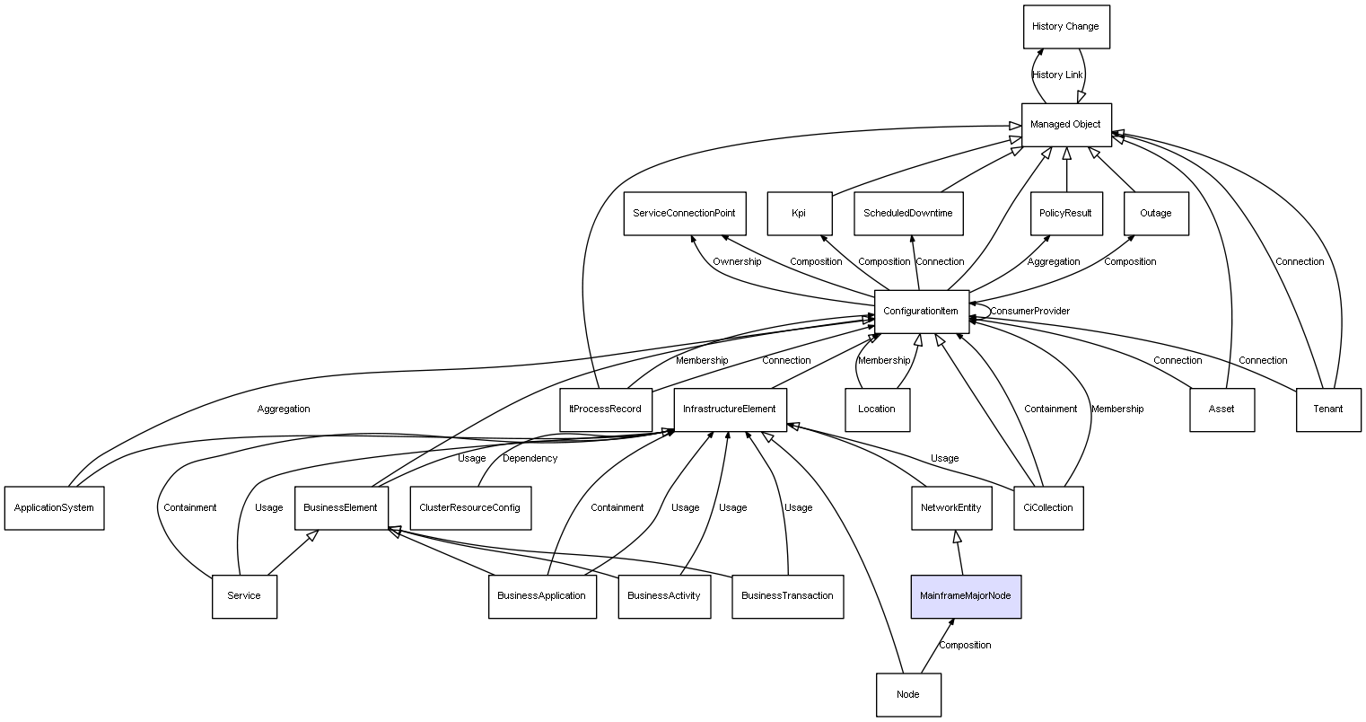 | Node | MainframeMajorNode | Composition | Represents a relation between 2 objects where one is contained within the other, and the included object can not exist without its container. Therefore, when the container is deleted, all its contained object will be automatically removed |