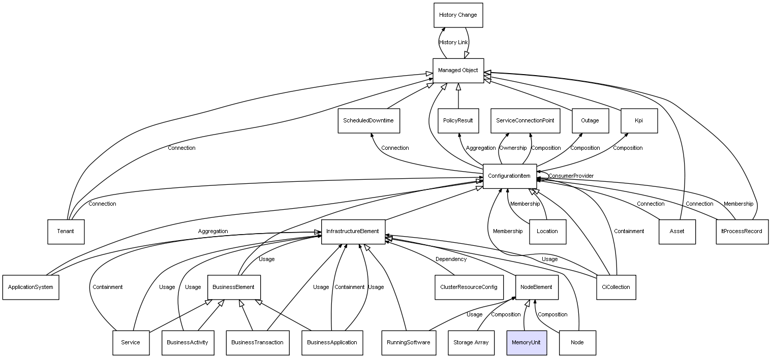 | ConfigurationItem | Outage | Composition | Represents a relation between 2 objects where one is contained within the other, and the included object can not exist without its container. Therefore, when the container is deleted, all its contained object will be automatically removed |