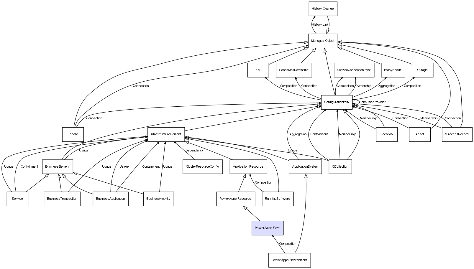| PowerApps Environment | PowerApps Flow | Composition | Represents a relation between 2 objects where one is contained within the other, and the included object can not exist without its container. Therefore, when the container is deleted, all its contained object will be automatically removed |
