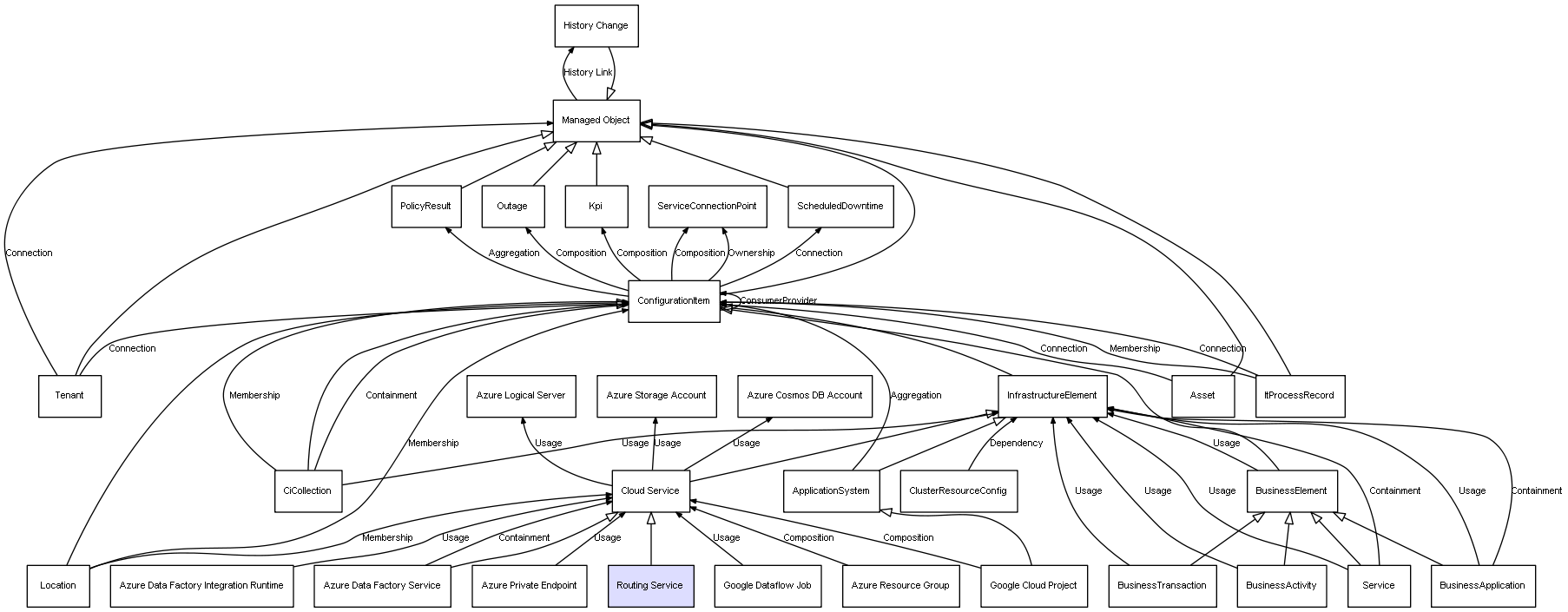 | Azure Resource Group | Cloud Service | Composition | Represents a relation between 2 objects where one is contained within the other, and the included object can not exist without its container. Therefore, when the container is deleted, all its contained object will be automatically removed |