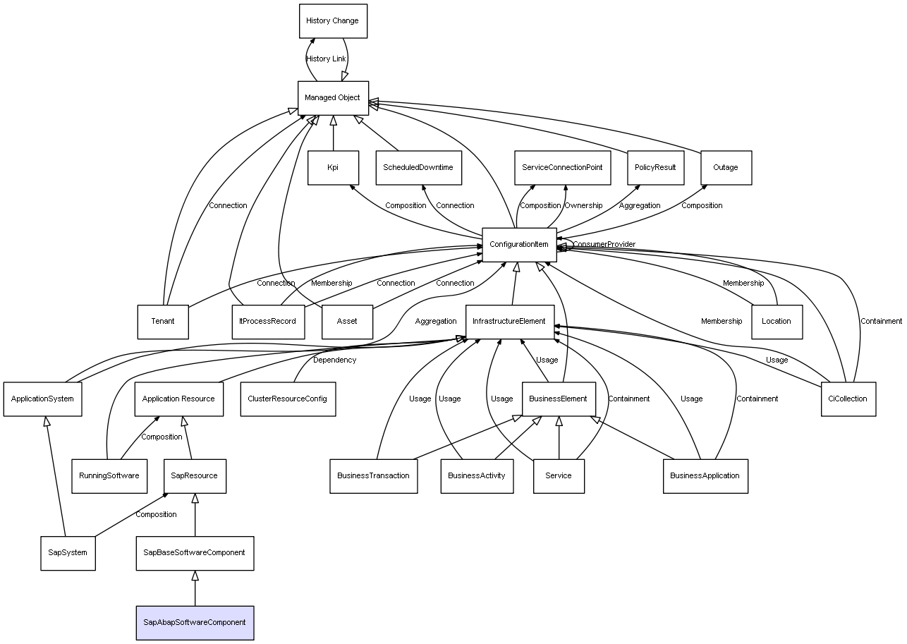 | SapSystem | SapResource | Composition | Represents a relation between 2 objects where one is contained within the other, and the included object can not exist without its container. Therefore, when the container is deleted, all its contained object will be automatically removed |