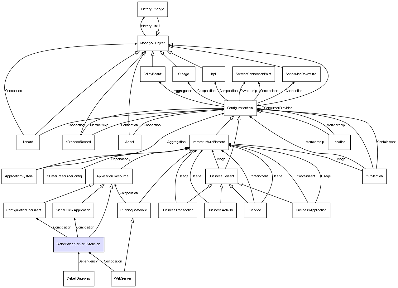 | WebServer | Siebel Web Server Extension | Composition | Represents a relation between 2 objects where one is contained within the other, and the included object can not exist without its container. Therefore, when the container is deleted, all its contained object will be automatically removed |