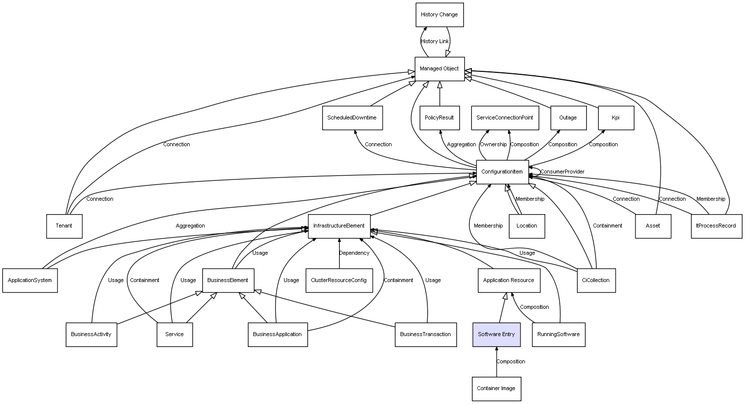 | Container Image | Software Entry | Composition | Represents a relation between 2 objects where one is contained within the other, and the included object can not exist without its container. Therefore, when the container is deleted, all its contained object will be automatically removed |