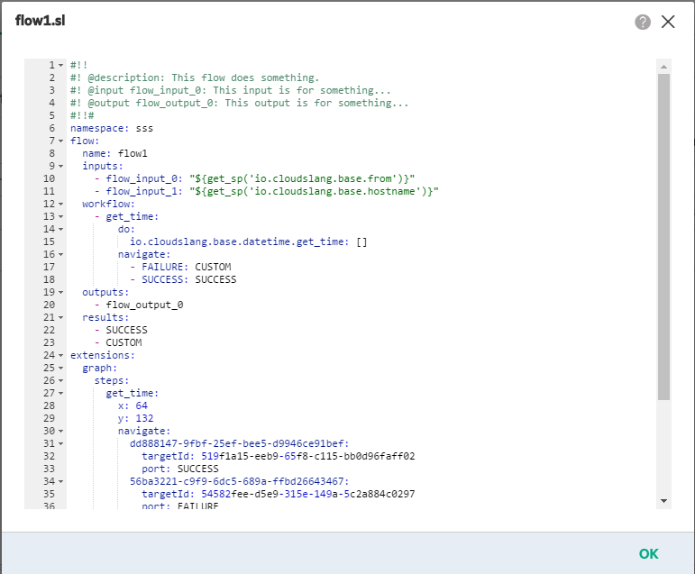 The third part (in blue), starting with extensions: provides the CloudSlang code that enables the graphical representation of the flow in the Graph tab. At run time, this section is ignored.