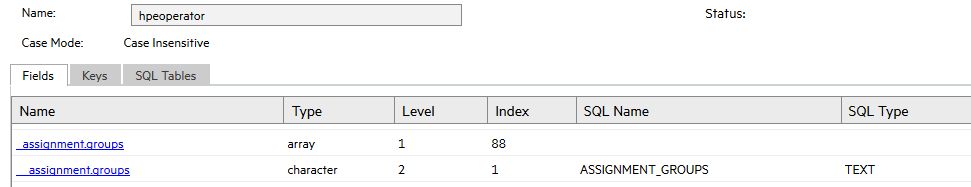 Suppose you want to remap the assignment.groups array field in the operator table from a field in a main table array to a multi-row array table array. To ensure that your tailoring efforts do not negatively impact your system, you should first make a copy of the operator table. For example, create a new table called hpeoperator.
