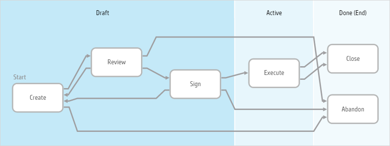 The starting point for contract, when the contract is drawn up. The result of the phase is the successful creation of a contract. If the contract is ready for internal stakeholders’ review, the Contract Manager can manually transition the contract to the Review phase. If the contract is canceled, the Contract Manager can manually transition the contract to the Abandon phase. Next phase: Review or Abandon |