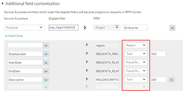 If you want to specify a data type for the PPM field, select one from the column highlighted below. This solves the data incompatibility issue between Service Management and PPM.