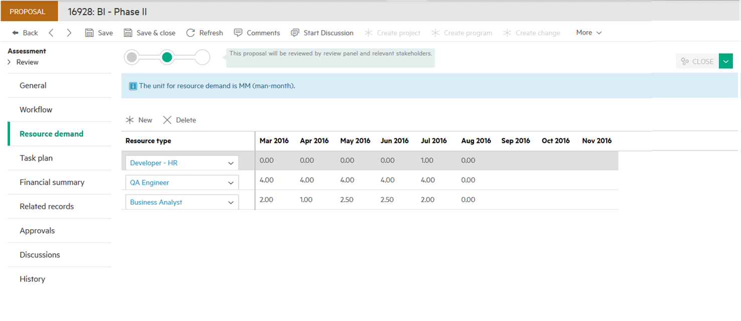 The planned cost or resource demand and the business value are also recorded in the proposal. Take proposal 16928: BI - Phase II as an example:
