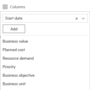 Carl wants to see the Start date and End date as well, as they are also important for the optimization. Carl clicks the Columns button in the top, selects the Start date column from the field list, and clicks Add to add it to the displayed columns. He does the same for the End date column.