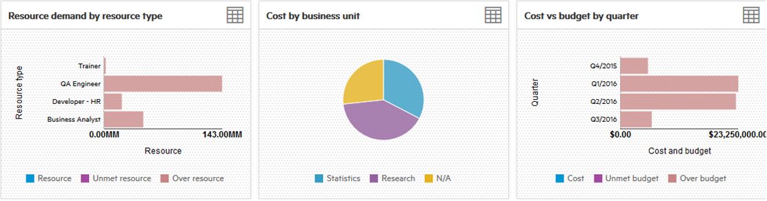 Secondly, with the budget and capacity set, the key statics and charts are also updated. Now, Carl sees that the budget can cover the total cost while the resource demand is over the capacity. The total business value is $103.25 million, showing Carl that he doesn’t have enough resources to complete the items within the time range.