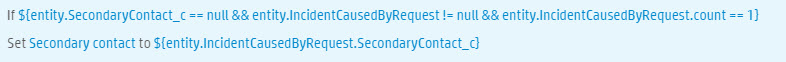 Parameter Value expression ${entity.SecondaryContact_c == null && entity.IncidentCausedByRequest != null && entity.IncidentCausedByRequest.count == 1} field Secondary contact value ${entity.IncidentCausedByRequest.SecondaryContact_c} The rule should appear as follows: