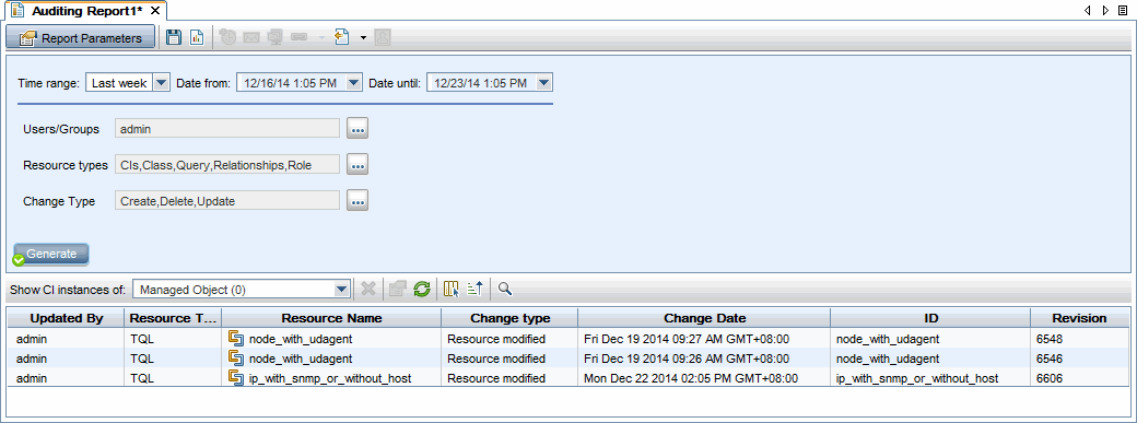 This report displays auditing information about CIs, Relationships and many Unified Resource Manager (URM) resources.