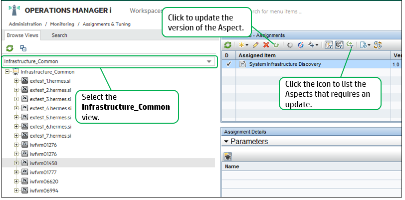 You can update the existing deployed Management Templates and Aspects to the latest version. Essential System Management Template contains aspects that required configurations (for Adaptive Thresholding, Change Configuration Monitor, Key System Services Availability, and Realtime Resource Bottleneck aspects) before you upgrade. For more information about configuration, see Systems Infrastructure Aspects.