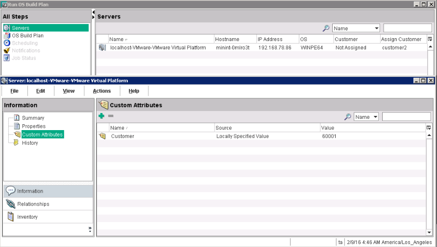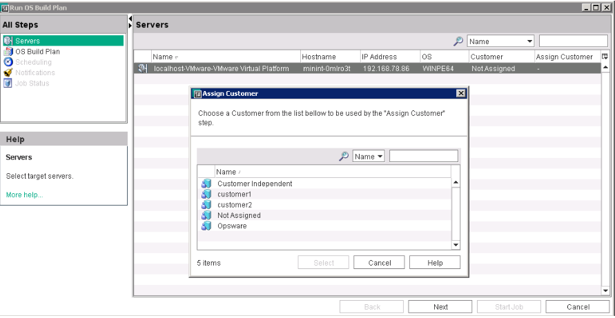 If the Customer Custom Attribute is already present on the server, it will be changed to the new value when the assignment is done from the interface. The customer specified by ID in the Custom Attribute on the servers will be retrieved by the Run OS Build Plan interface in the Servers View and displayed in the Assign Customer column.