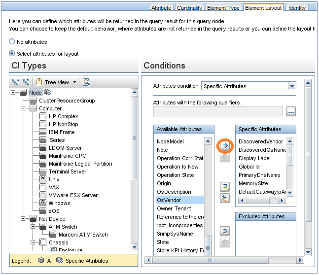 - Select the CI attribute you want to include in the integration from the Available Attributes list, and click the Add button to add it to Specific Attributes list. For example, OsVendor.