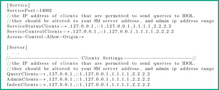 The Distributed Service Manager Service Portal scripts implement the following changes to the main IDOL server configuration file /opt/hp/SmartAnalytics/IDOL/IDOLServer.cfg on each Service Manager Service Portal node: