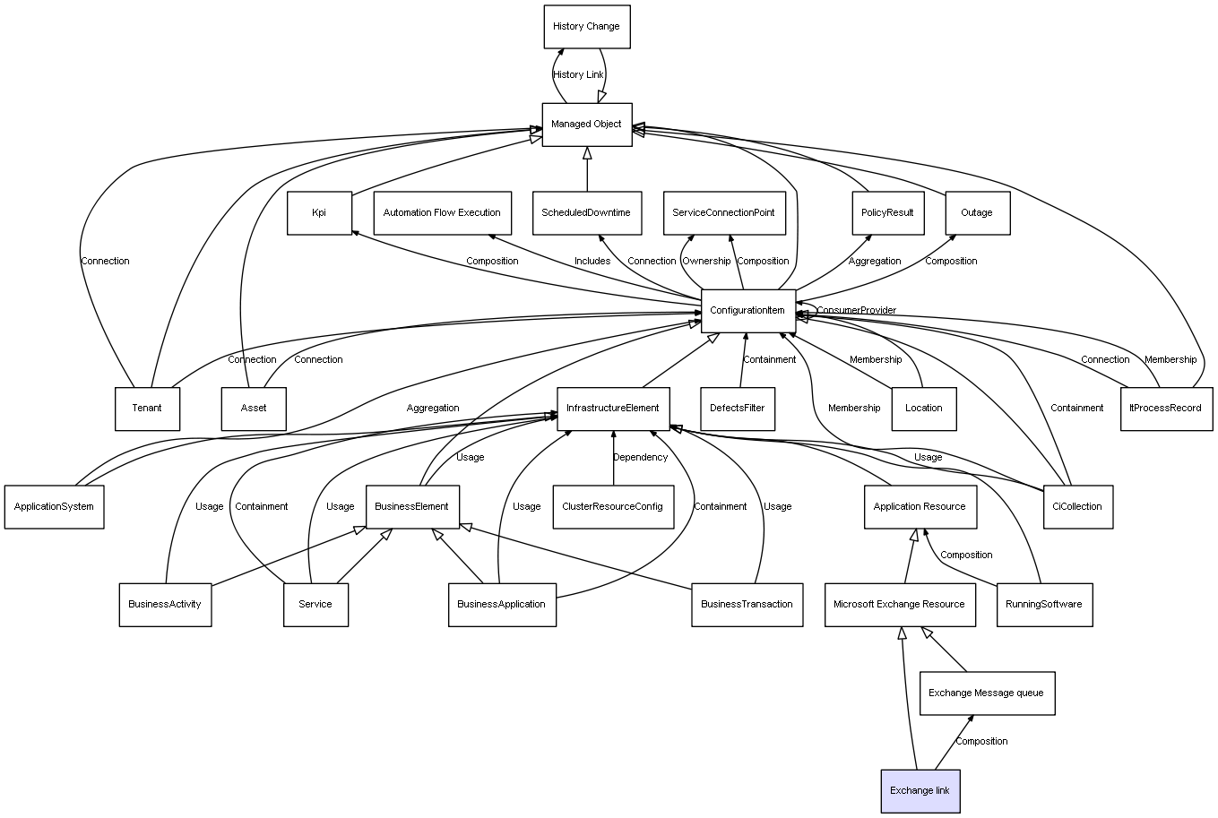 | ConfigurationItem | ServiceConnectionPoint | Composition | Represents a relation between 2 objects where one is contained within the other, and the included object can not exist without its container. Therefore, when the container is deleted, all its contained object will be automatically removed |