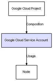 | Google Cloud Project | Google Cloud Service Account | Composition | Represents a relation between 2 objects where one is contained within the other, and the included object can not exist without its container. Therefore, when the container is deleted, all its contained object will be automatically removed |