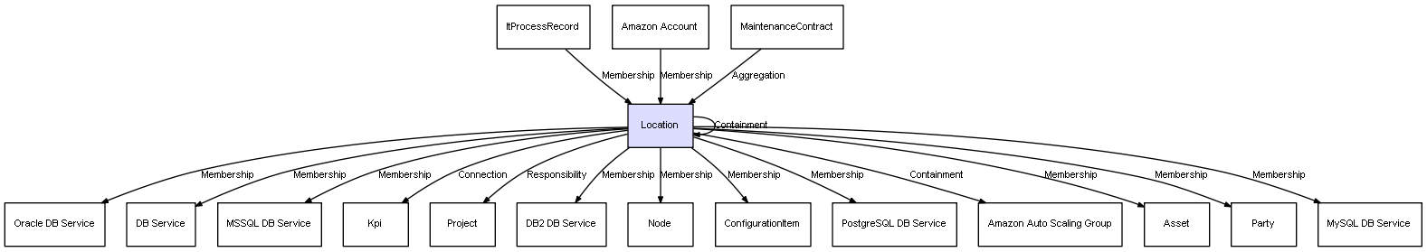 | Description | Location of devices and business organizations/people that support a function (i.e. data center, company/client site). Can vary from country to city or low level like building or room. It can be connected to devices and logical CIs representing end users or data center location. |