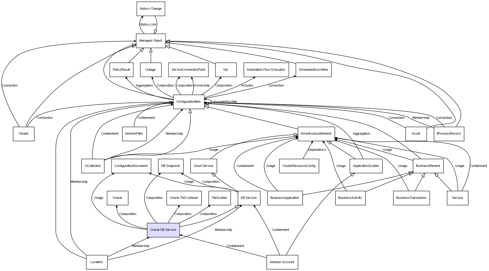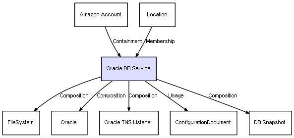| Oracle DB Service | Oracle | Composition | Represents a relation between 2 objects where one is contained within the other, and the included object can not exist without its container. Therefore, when the container is deleted, all its contained object will be automatically removed |