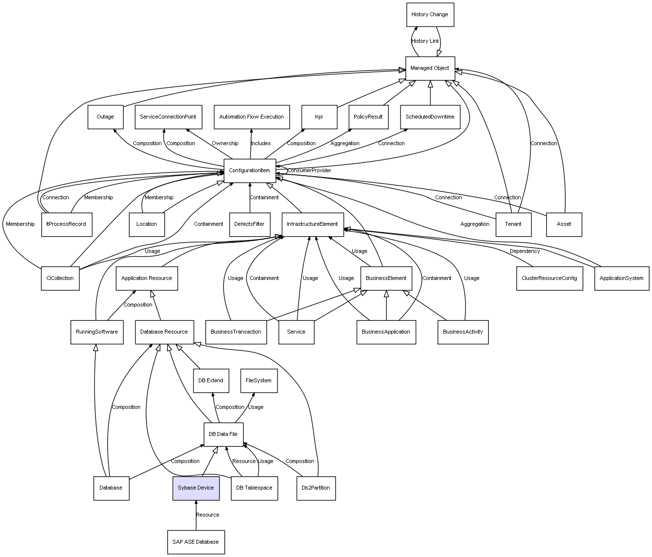 | SAP ASE Database | Sybase Device | Resource | Represents a relation between an object and its resource |