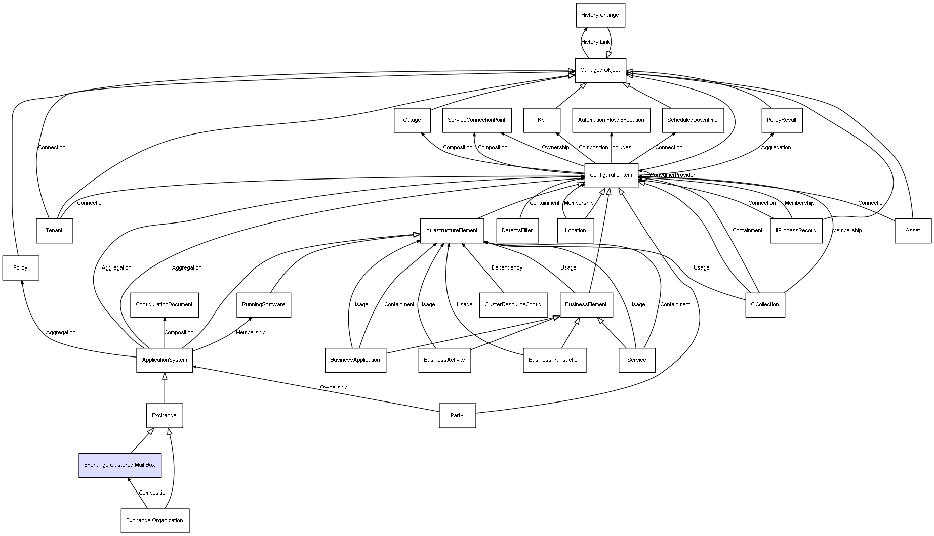 Exchange OrganizationExchange Clustered Mail Box CompositionRepresents a relation between 2 objects where one is contained within the other, and the included object can not exist without its container. Therefore, when the container is deleted, all its contained object will be automatically removed