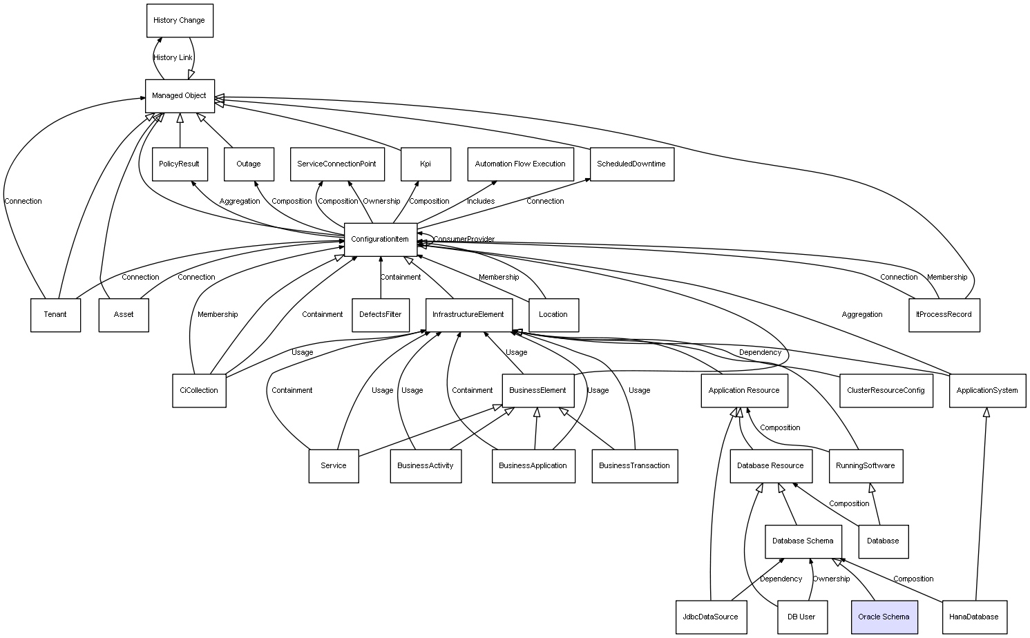 | ConfigurationItem | ServiceConnectionPoint | Composition | Represents a relation between 2 objects where one is contained within the other, and the included object can not exist without its container. Therefore, when the container is deleted, all its contained object will be automatically removed |
