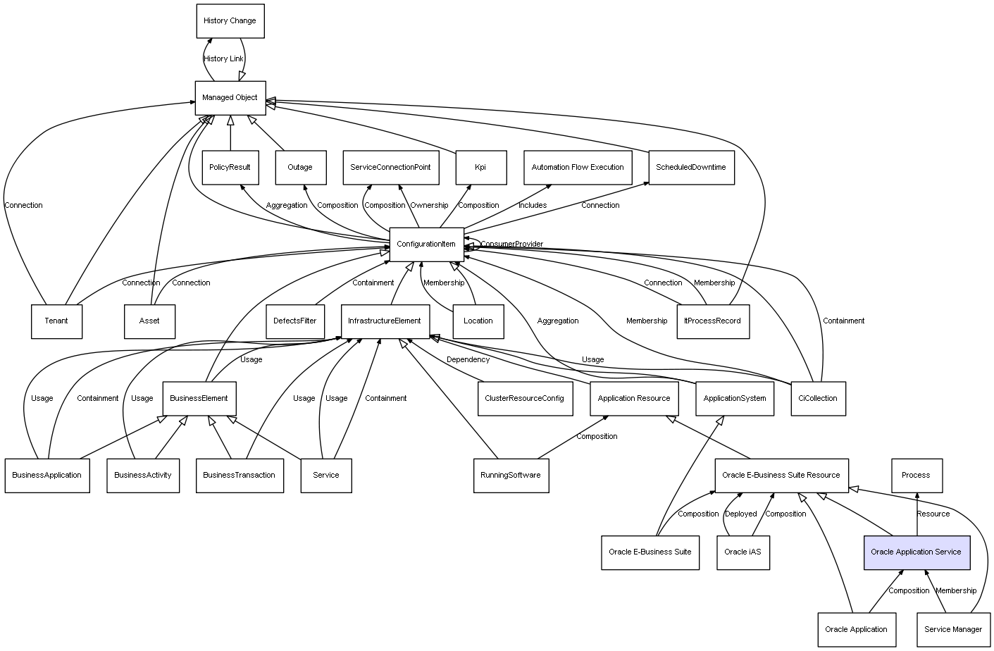 | Oracle Application | Oracle Application Service | Composition | Represents a relation between 2 objects where one is contained within the other, and the included object can not exist without its container. Therefore, when the container is deleted, all its contained object will be automatically removed |