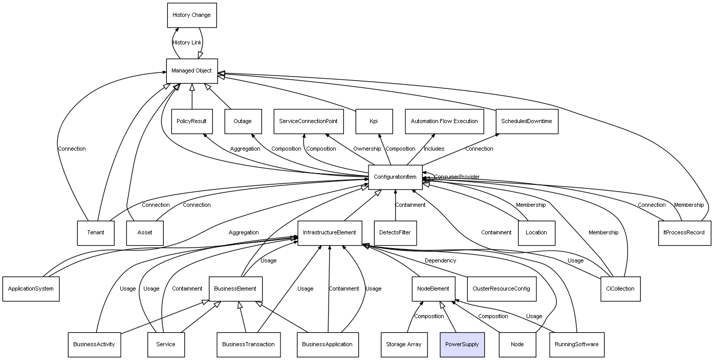 | ConfigurationItem | Outage | Composition | Represents a relation between 2 objects where one is contained within the other, and the included object can not exist without its container. Therefore, when the container is deleted, all its contained object will be automatically removed |