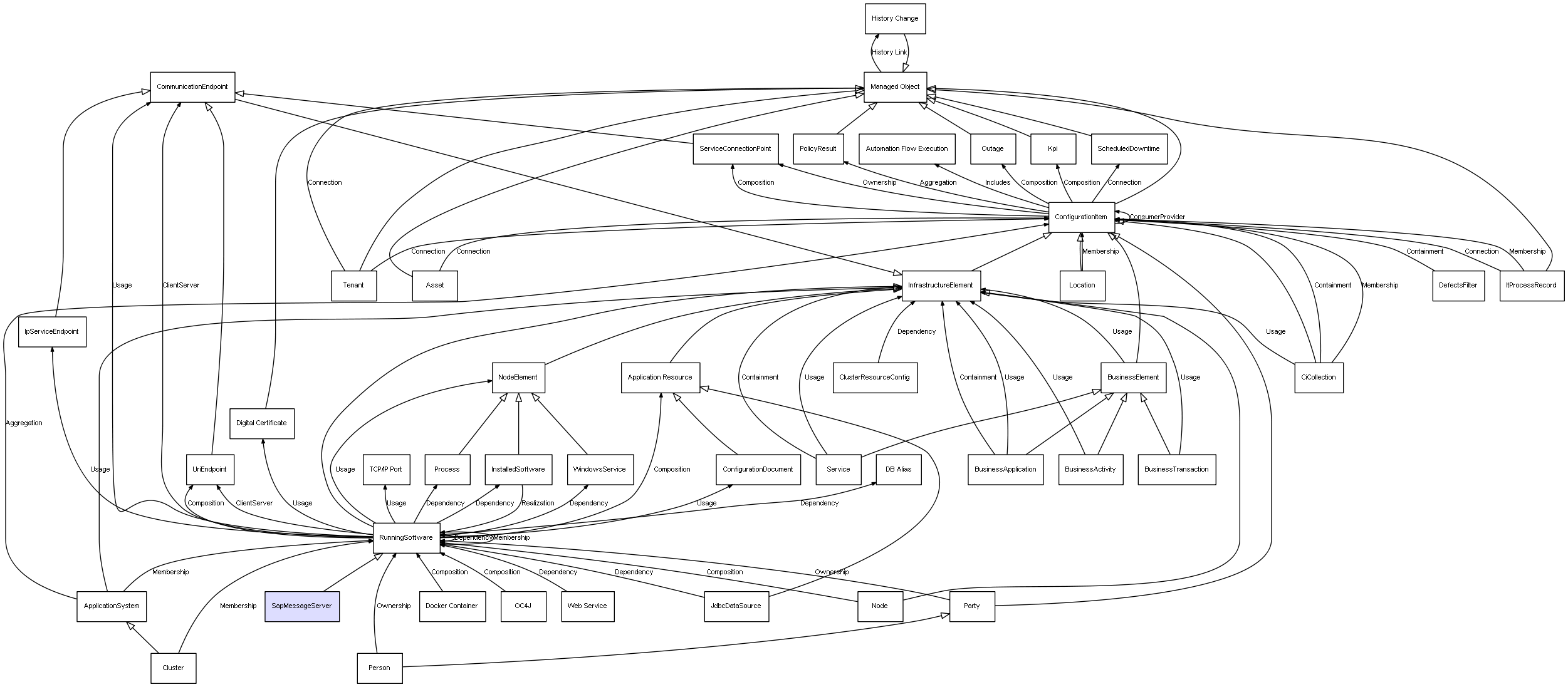 | ConfigurationItem | ServiceConnectionPoint | Composition | Represents a relation between 2 objects where one is contained within the other, and the included object can not exist without its container. Therefore, when the container is deleted, all its contained object will be automatically removed |