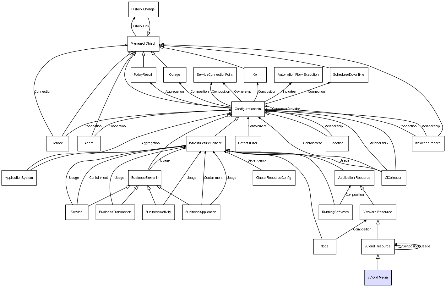 | vCloud Resource | vCloud Resource | Composition | Represents a relation between 2 objects where one is contained within the other, and the included object can not exist without its container. Therefore, when the container is deleted, all its contained object will be automatically removed |