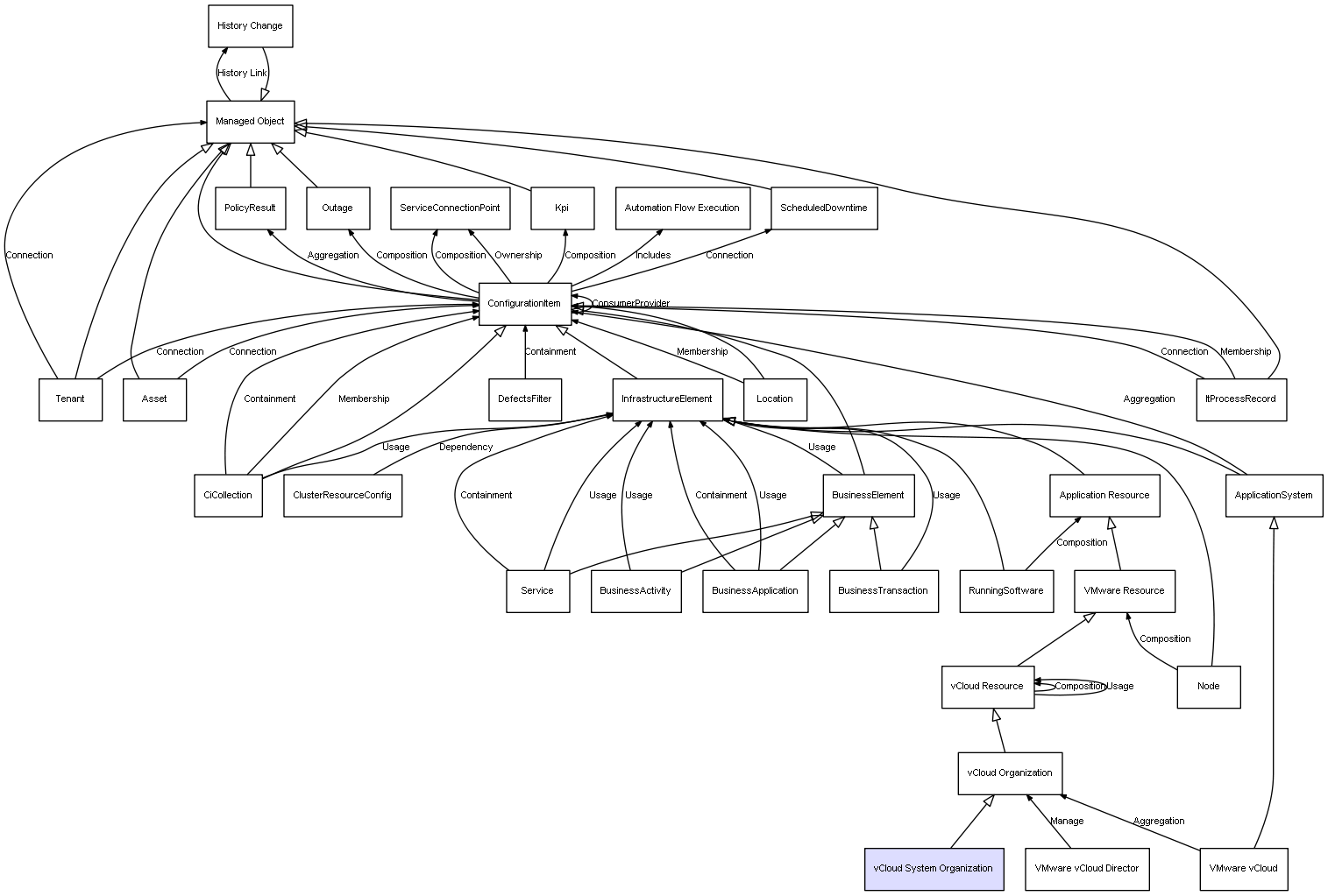 | vCloud Resource | vCloud Resource | Composition | Represents a relation between 2 objects where one is contained within the other, and the included object can not exist without its container. Therefore, when the container is deleted, all its contained object will be automatically removed |