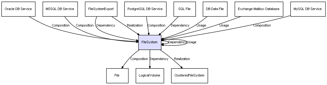 PostgreSQL DB ServiceFileSystemCompositionRepresents a relation between 2 objects where one is contained within the other, and the included object can not exist without its container. Therefore, when the container is deleted, all its contained object will be automatically removed