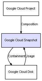 | Google Cloud Project | Google Cloud Snapshot | Composition | Represents a relation between 2 objects where one is contained within the other, and the included object can not exist without its container. Therefore, when the container is deleted, all its contained object will be automatically removed |