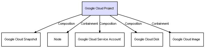 | Google Cloud Project | Google Cloud Snapshot | Composition | Represents a relation between 2 objects where one is contained within the other, and the included object can not exist without its container. Therefore, when the container is deleted, all its contained object will be automatically removed |