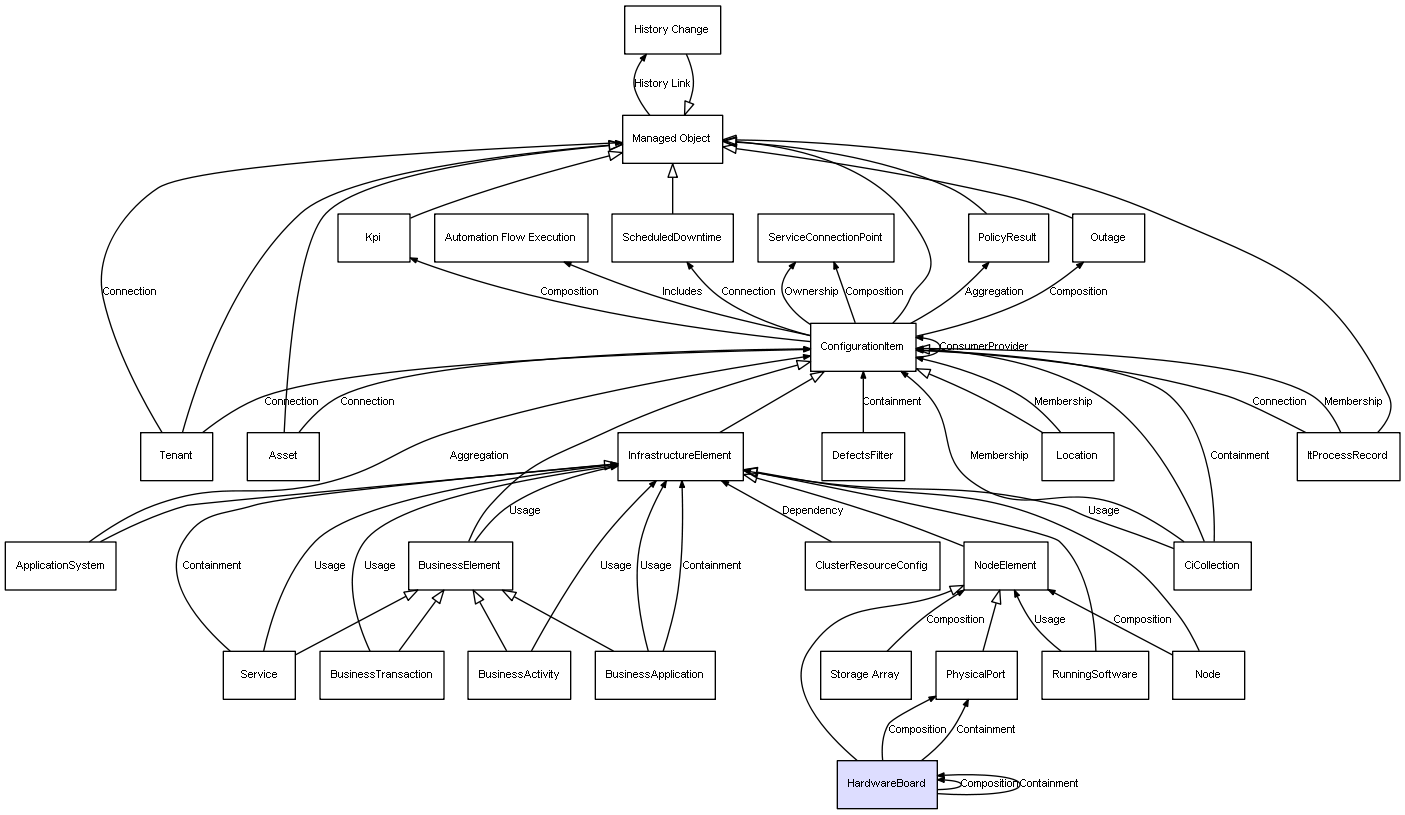 HardwareBoardPhysicalPortCompositionRepresents a relation between 2 objects where one is contained within the other, and the included object can not exist without its container. Therefore, when the container is deleted, all its contained object will be automatically removed