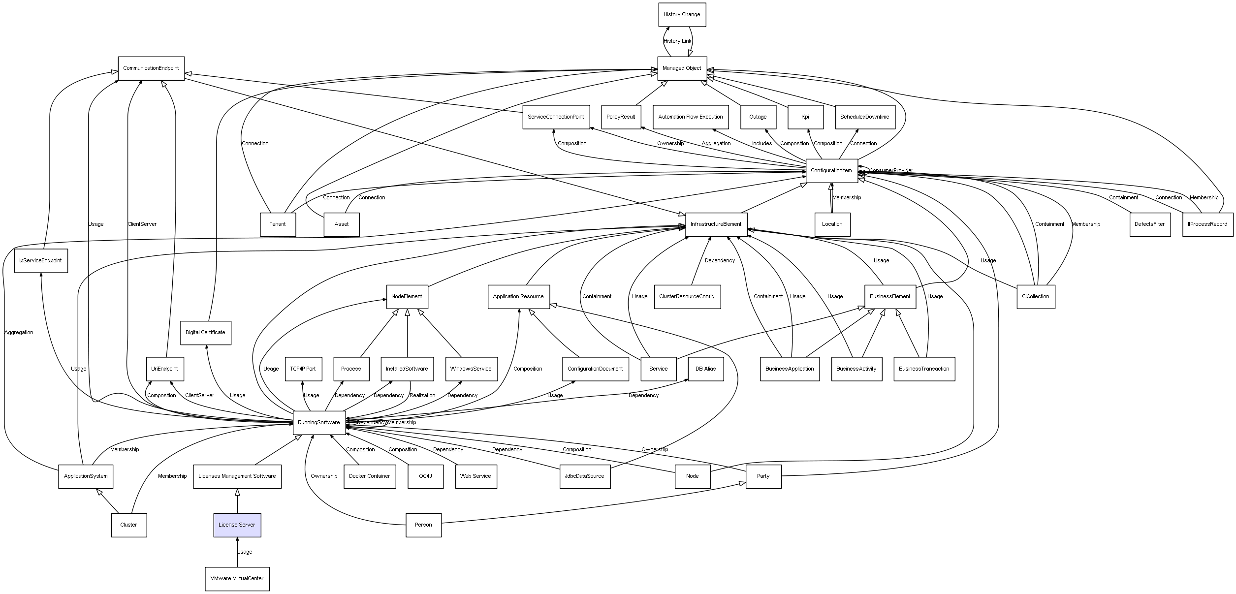 | ConfigurationItem | ServiceConnectionPoint | Composition | Represents a relation between 2 objects where one is contained within the other, and the included object can not exist without its container. Therefore, when the container is deleted, all its contained object will be automatically removed |
